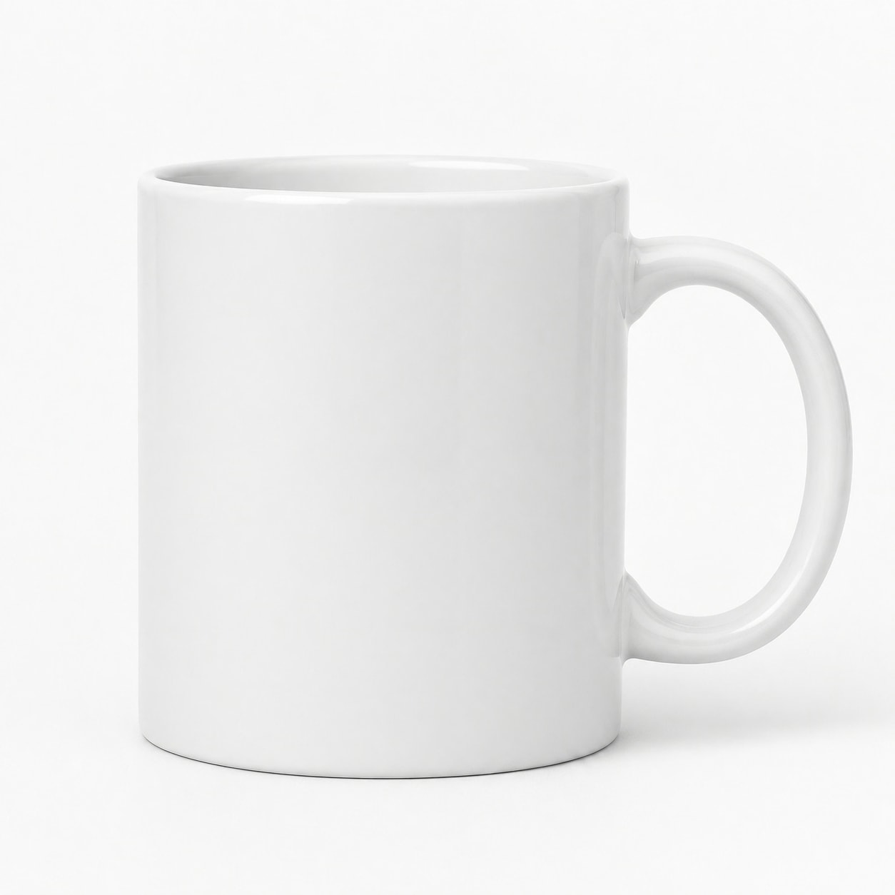 Белая керамическая кружка на чистом студийном фоне, мягкий свет, фронтальный ракурс, видна форма и фактура материала.