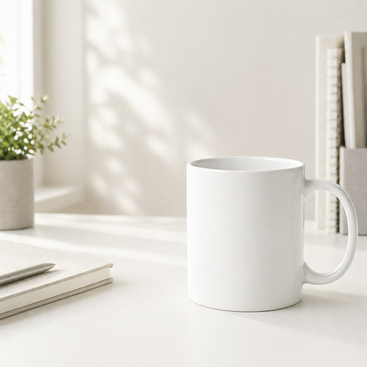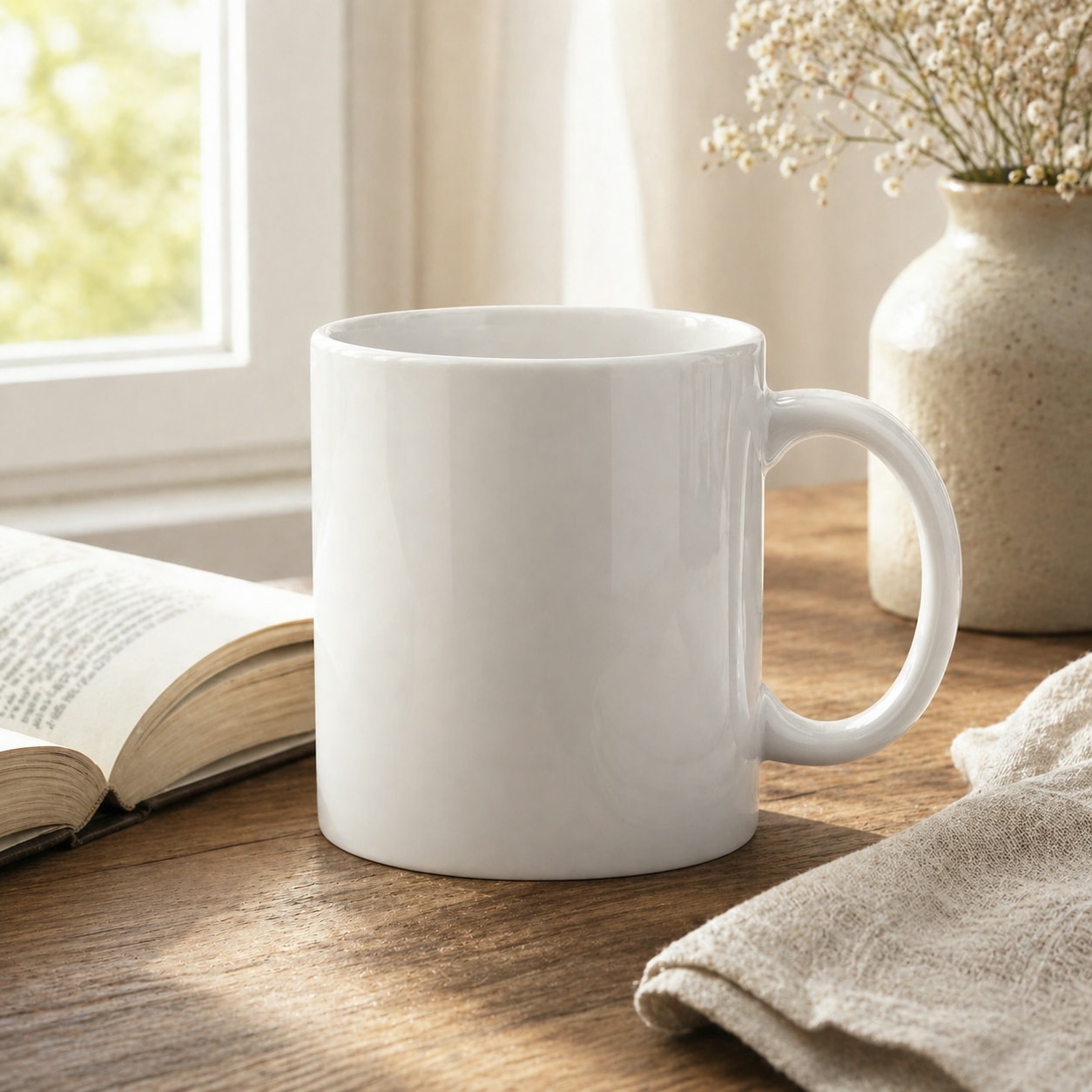 Белая керамическая кружка на деревянном столе у окна, утренний мягкий свет, рядом книга и льняная салфетка, спокойная домашняя атмосфера.