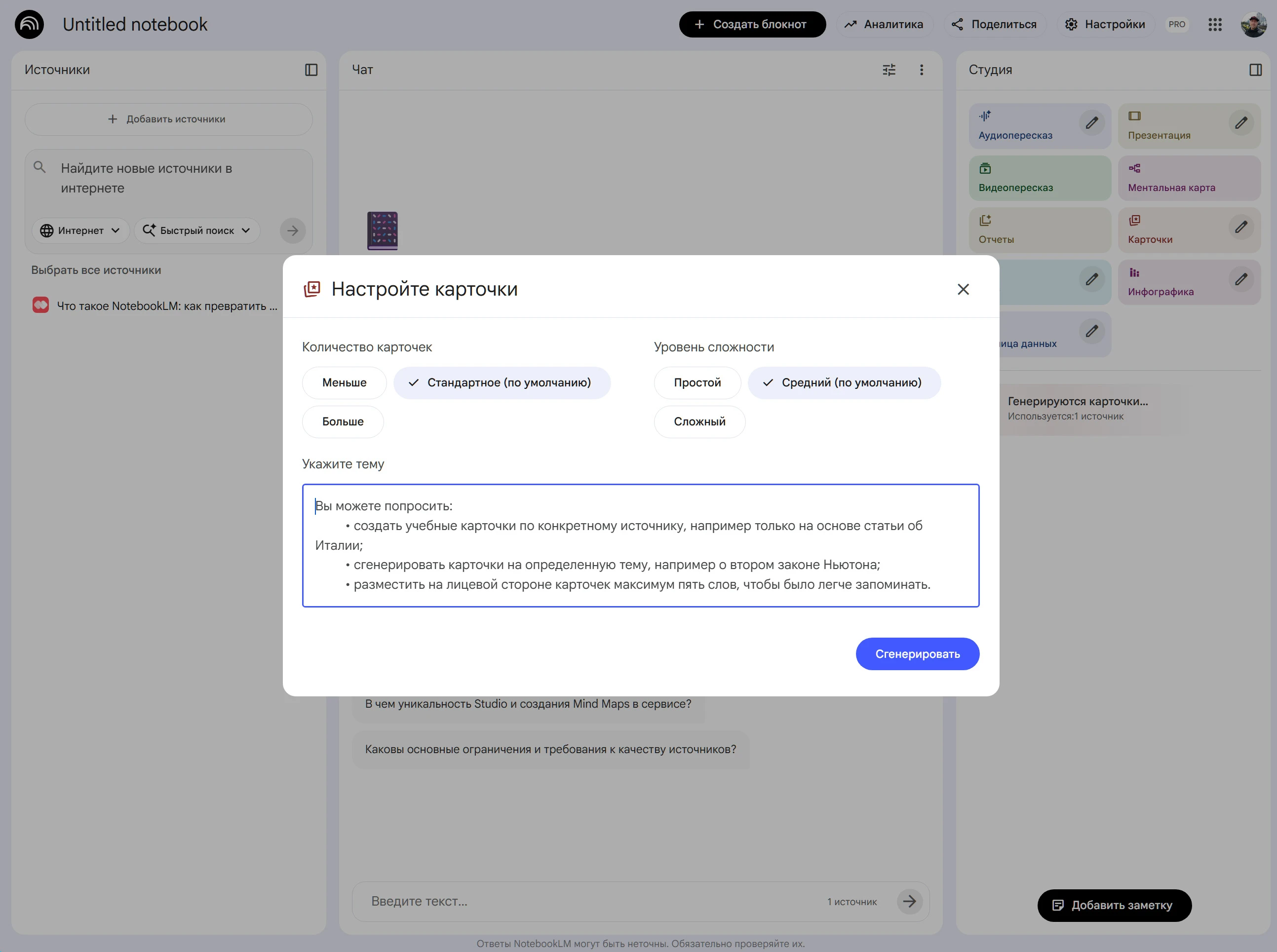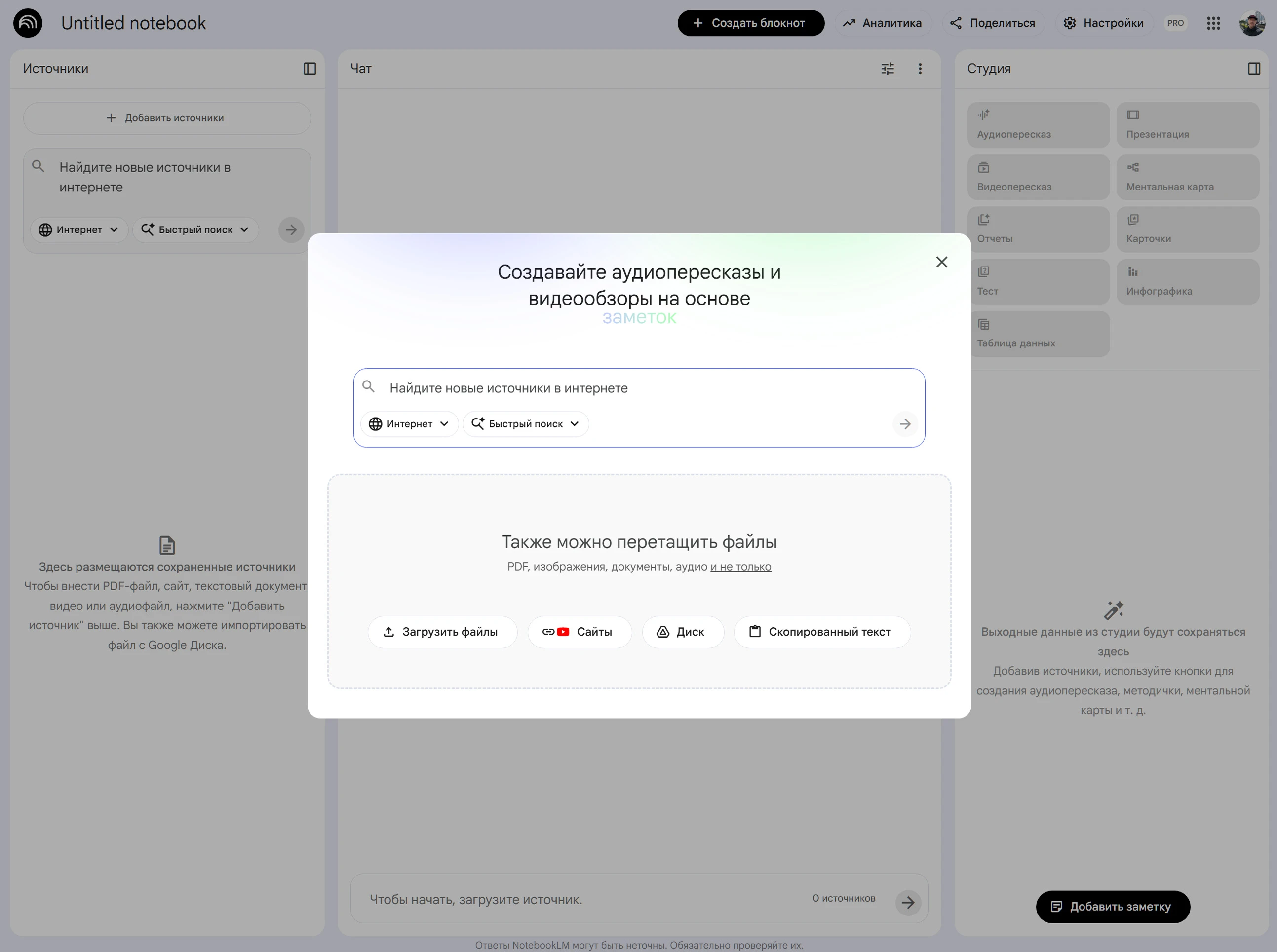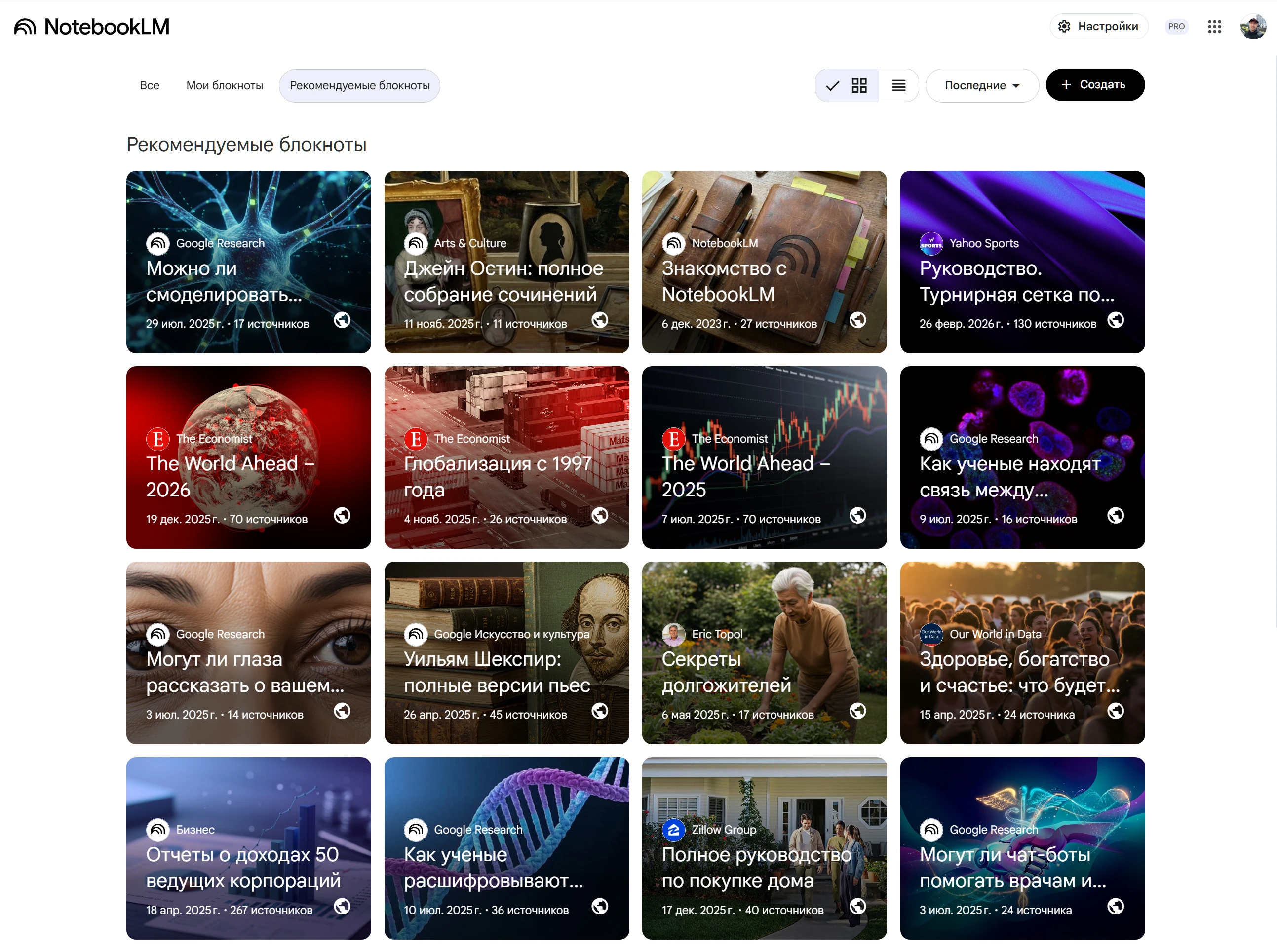Базовая единица здесь — блокнот. Это не просто папка с файлами, а контейнер под одну тему. В стандартной версии NotebookLM доступно до 100 блокнотов, в каждом — до 50 источников, а размер одного источника может доходить до 500 000 слов или до 200 МБ для локальной загрузки. У Google нет ограничения по числу страниц как таковому; ограничение задается объемом текста и размером файла. (Google Hilfe)