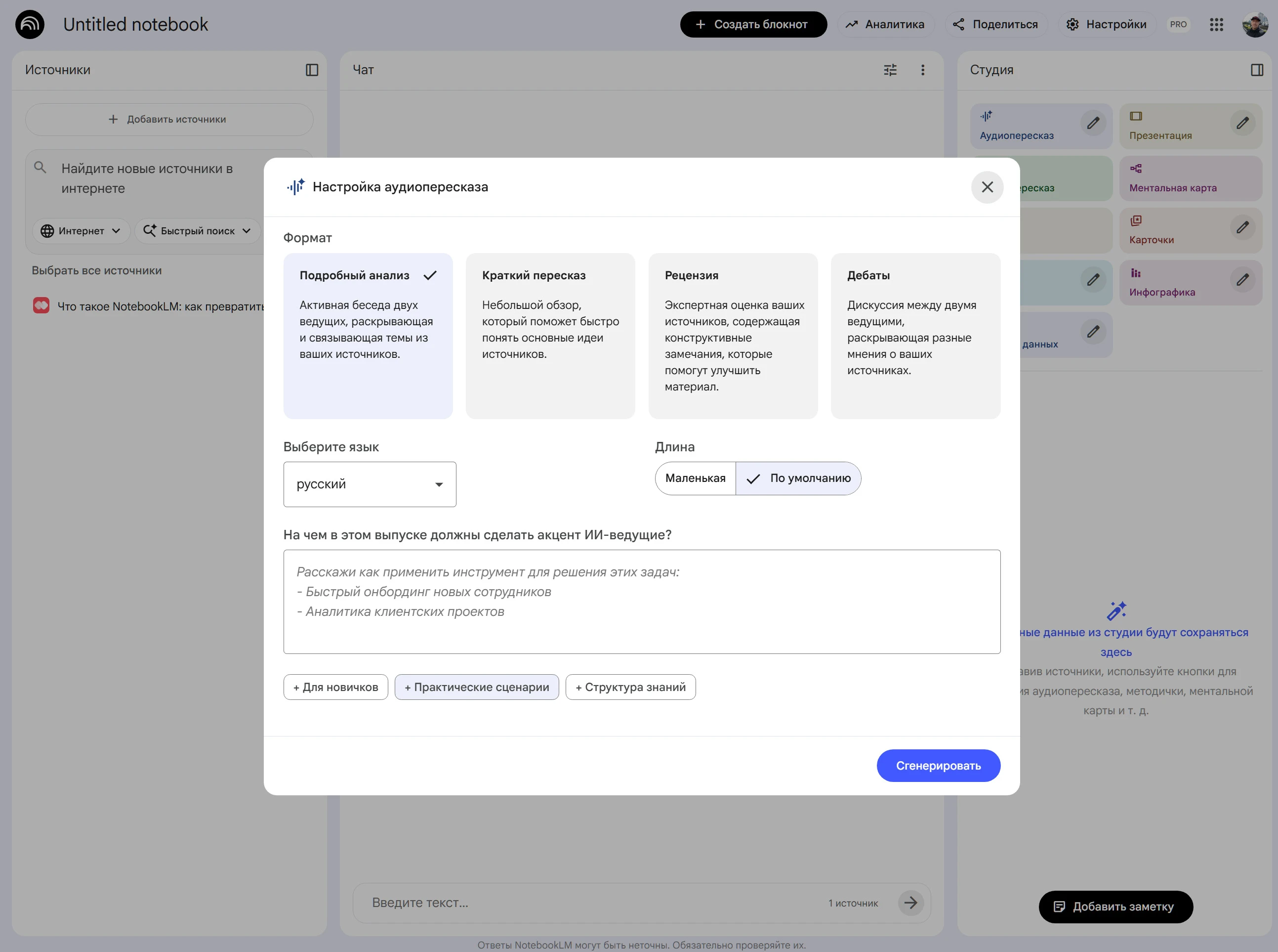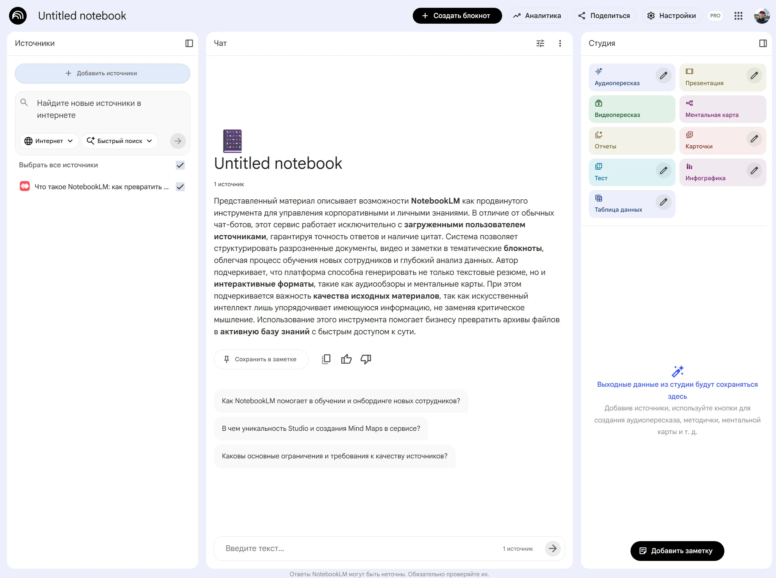 Четвертый сценарий — подготовка к встречам, обучению и внутренним отчетам. Когда материалы собраны в блокнот, проще освежить тему перед созвоном, быстро восстановить контекст после паузы, подготовить краткое объяснение для коллег или собрать основу для внутреннего документа. Здесь ценность не в том, что сервис «думает вместо человека», а в том, что он сокращает рутину на поиск, перечитывание и ручное сведение источников.