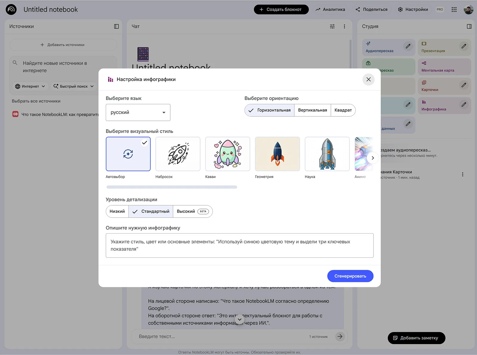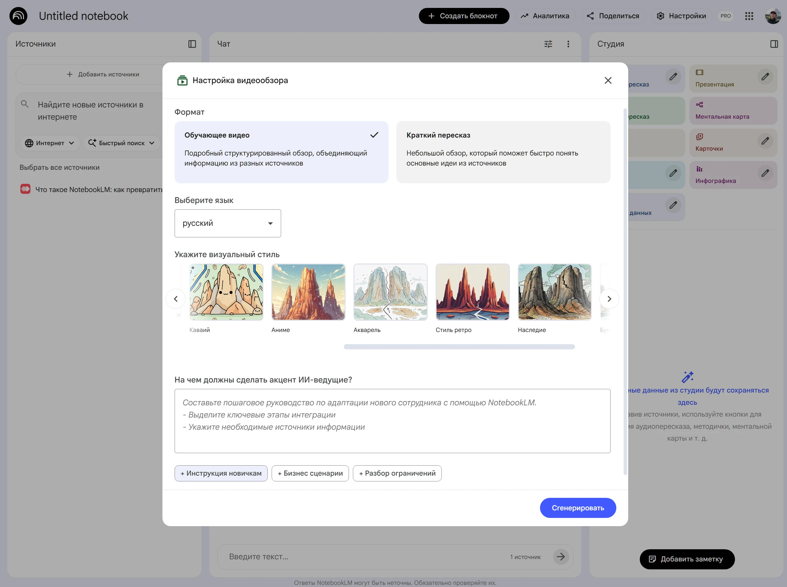 Отдельного внимания заслуживают Audio Overviews и Video Overviews. Audio Overview Google описывает как генерируемый внутри блокнота аудиоформат по загруженным источникам, а Video Overview — как отдельный визуальный обзор, который создается через Studio. В 2025–2026 годах Google активно развивал именно этот слой NotebookLM: сначала как Video Overviews и обновленную Studio, а затем как Cinematic Video Overviews. Для практики это означает простую вещь: один и тот же массив материалов можно не только читать, но и переупаковывать в форматы, которые удобнее воспринимать на ходу или обсуждать в команде. (Google Hilfe)