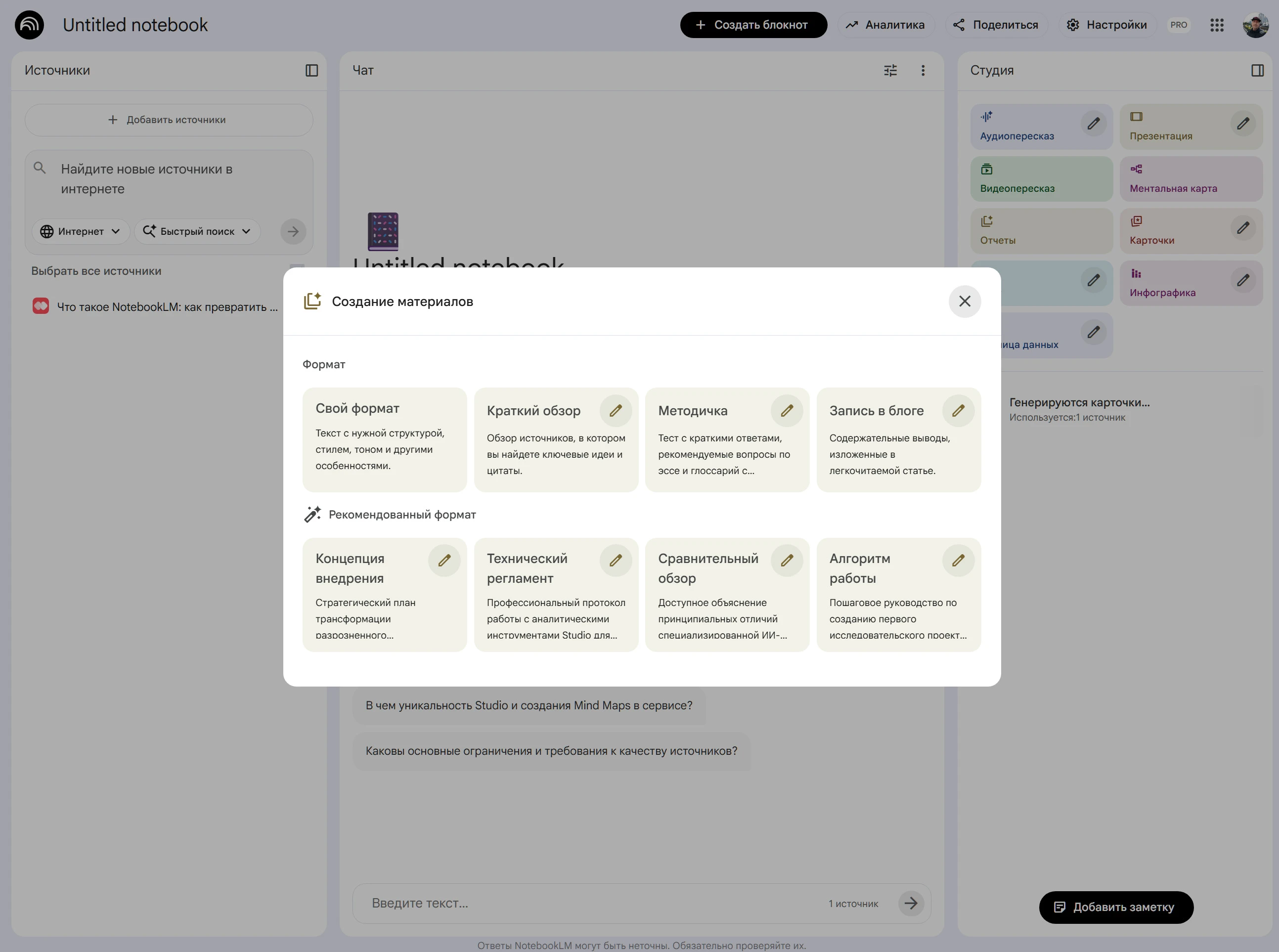 Дальше стоит собрать 5–10 действительно ключевых источников, а не все подряд. После загрузки материалов имеет смысл задать несколько простых вопросов: что здесь главное, какие решения уже приняты, где есть противоречия, какие риски повторяются, что нужно объяснить новичку в первую очередь. Уже на этом этапе обычно становится видно, помогает ли инструмент именно в вашей задаче. А если помогает, следующий шаг очевиден: не просто читать ответы, а превращать их в заметки, отчеты и внутренние документы, которые остаются в рабочем процессе. Возможности Notes, Reports, Mind Maps, Audio Overviews и Video Overviews как раз и сделаны для такой переупаковки знаний.